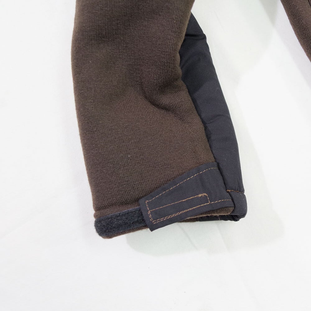 また、ショルダー部分と肘部分には補強のため摩擦に強いナイロン地が張られています。動きを妨げないよう脇下にはガゼットも設けられており、細部にこだわった仕様となっています。