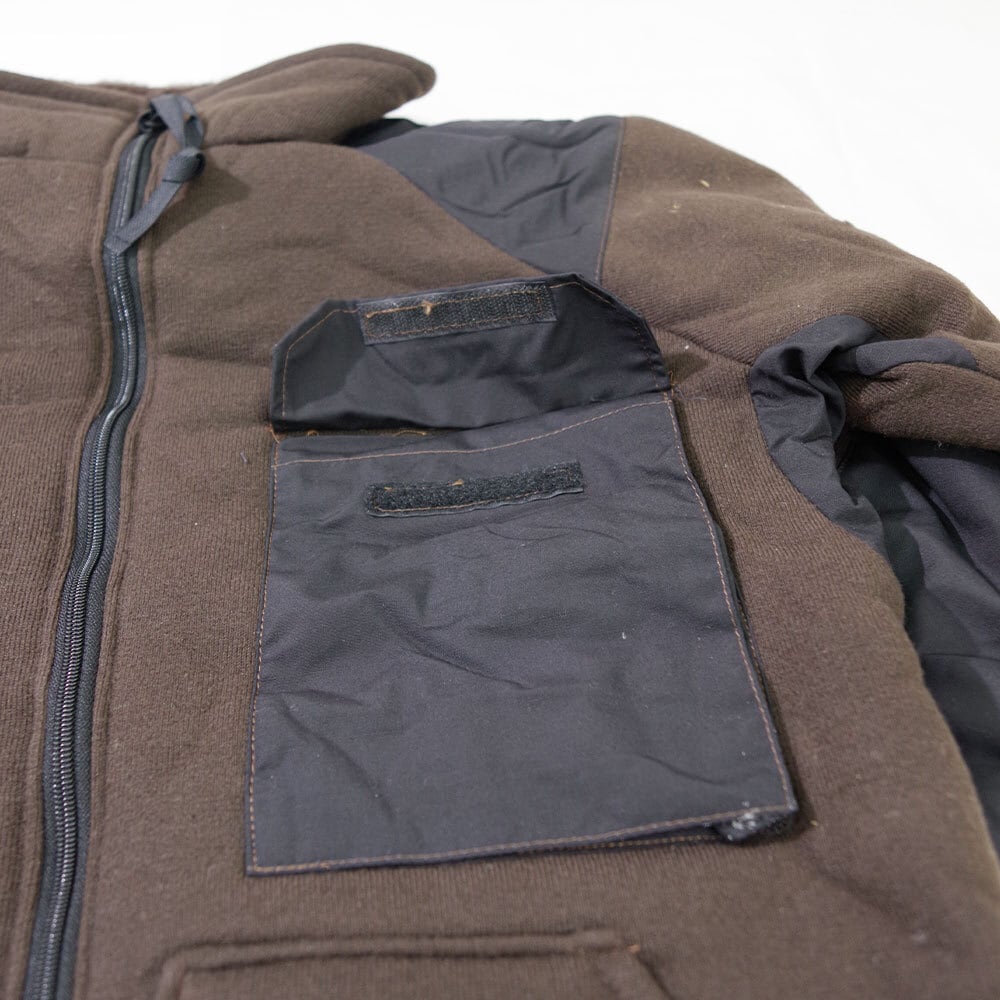環境や気温に応じて単体でも着用できるデザインとなっています。フロントにはベルクロ留めの胸ポケットとパッチポケットによるハンドウォーマーポケットが付いています。